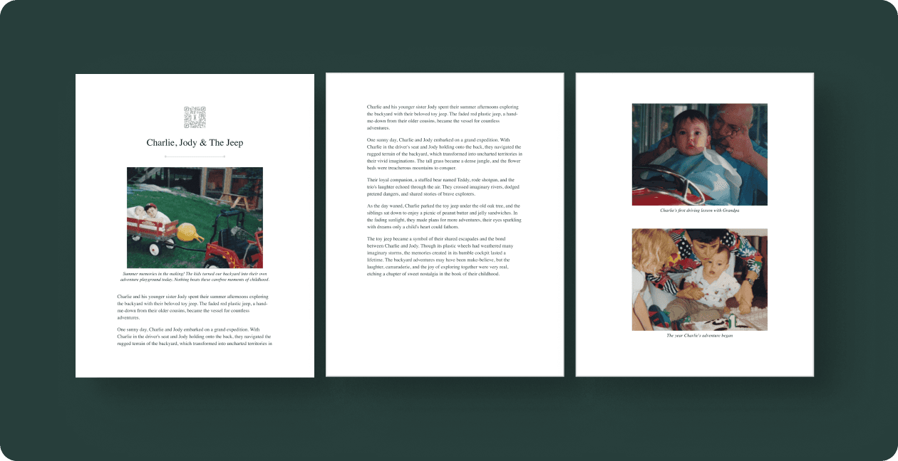 Your primary photo is placed below the QR code and title of the story. Your other photos will be placed at the end of the story. Remento books are printed in full-color.