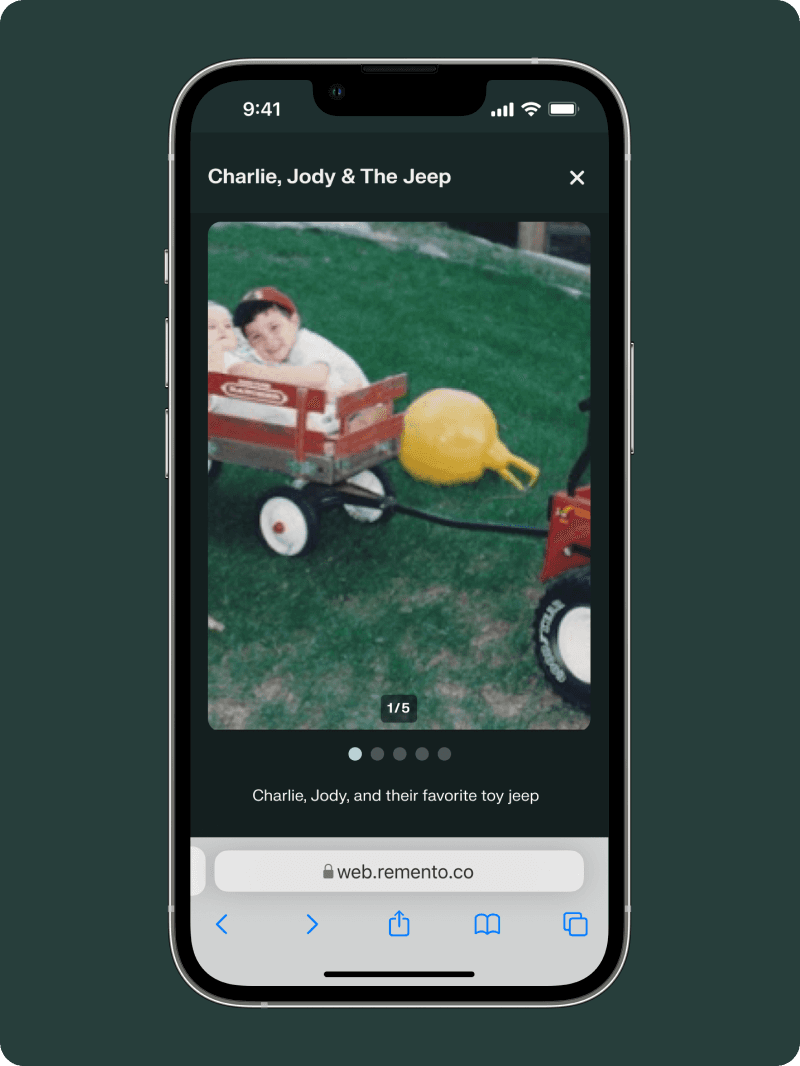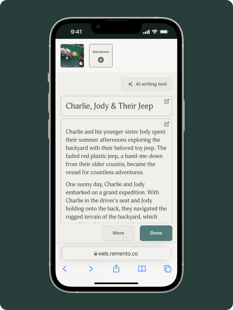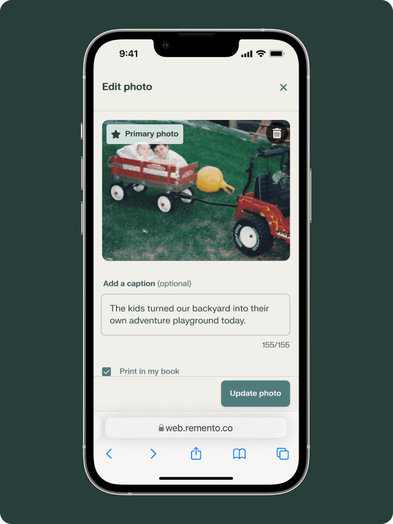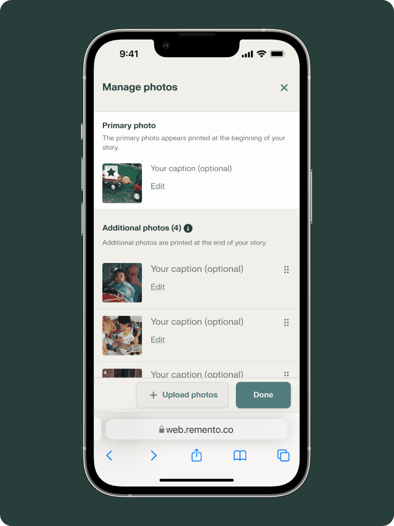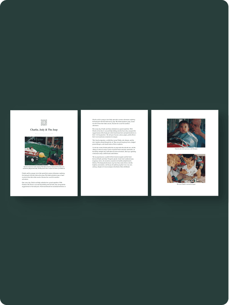 Your primary photo is placed below the QR code and title of the story. Your other photos will be placed at the end of the story. Remento books are printed in full-color.