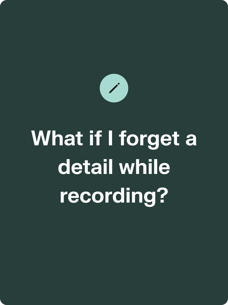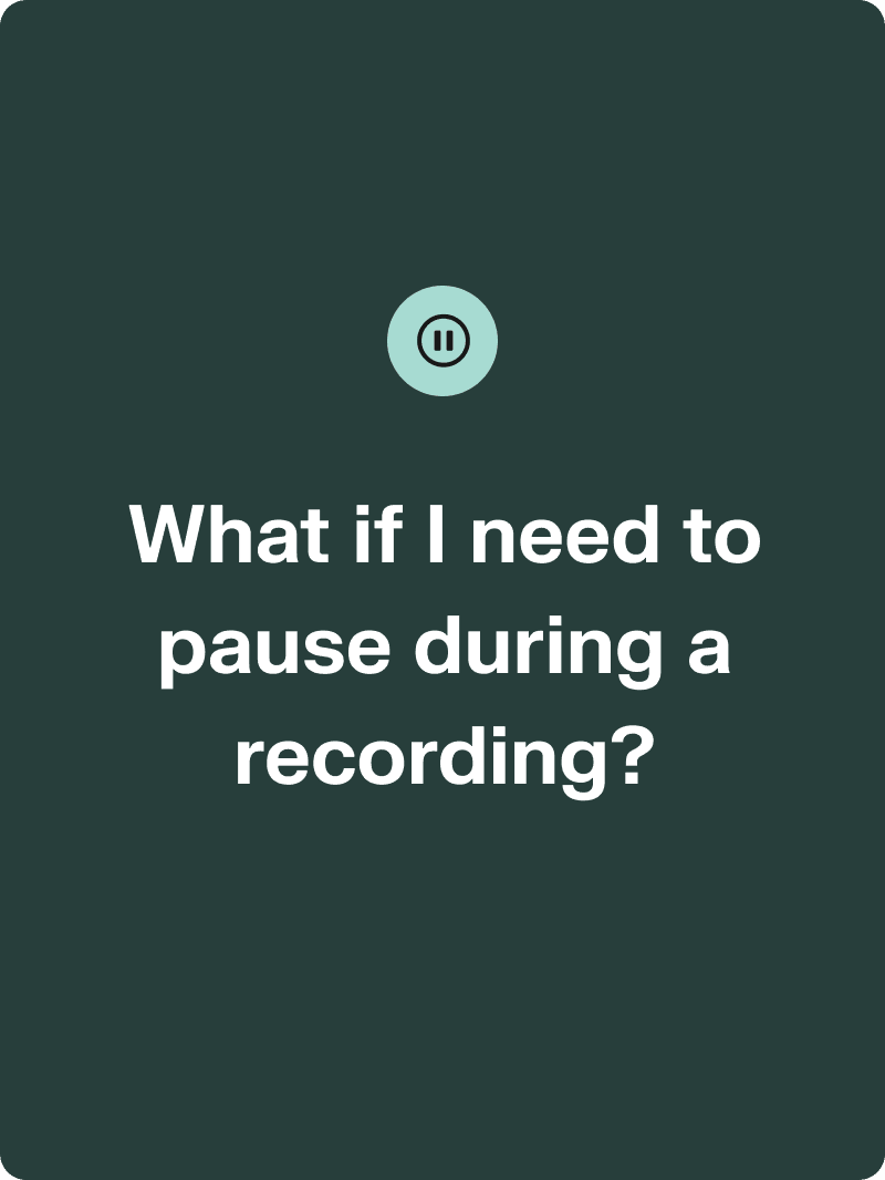 All recordings can be paused and then resumed. If you get interrupted or want to take a few minutes to think, you can just tap the PAUSE button.